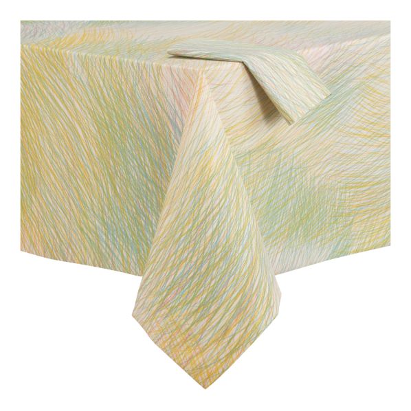 I'd start with this Marimekko Lepo Pastel tablecloth which looks like a field of blowing grasses. To add some dimension and whimsy, I'd set each place with the Posey placemat, the Tinge dinner plate, and the Summer Lemons glass